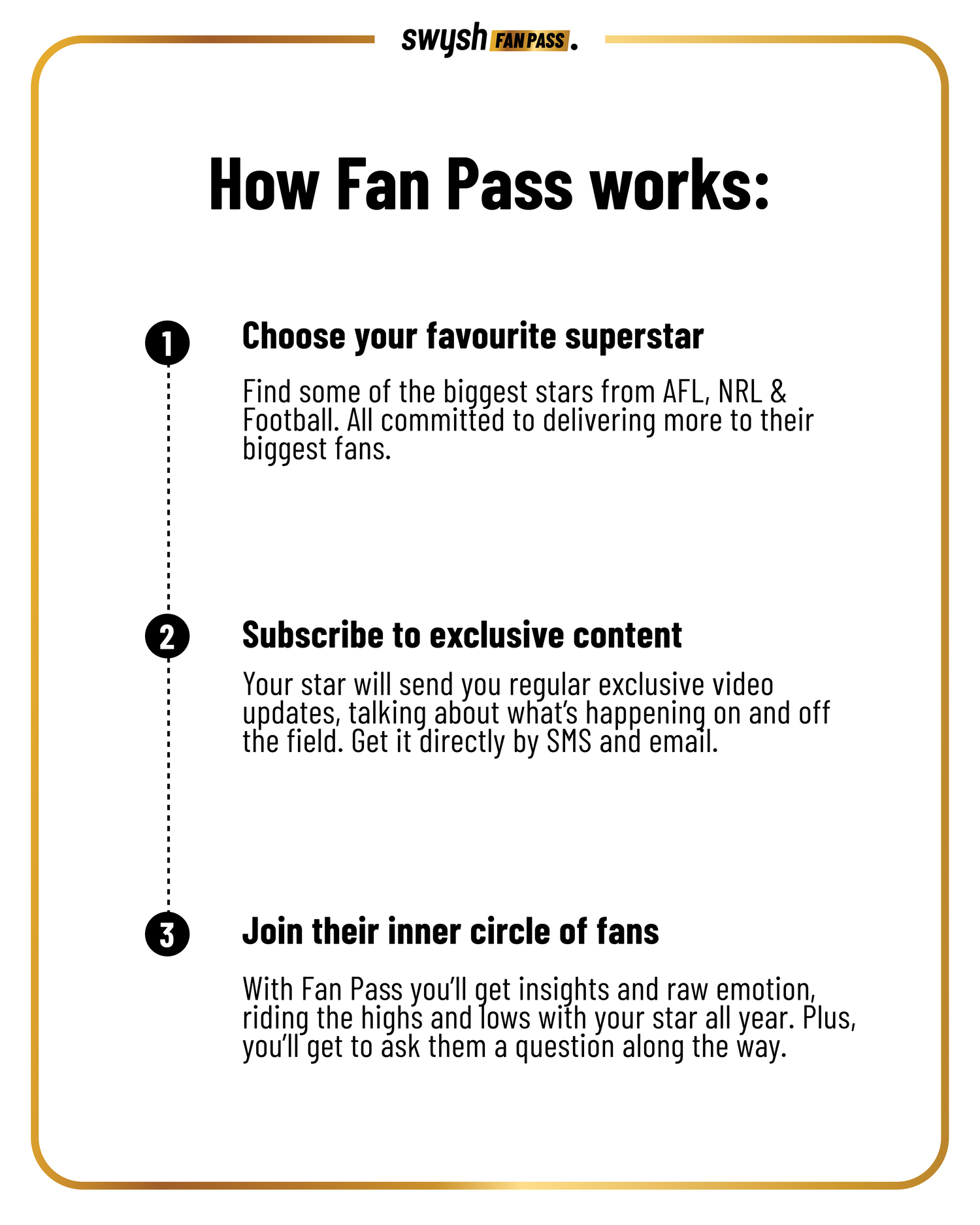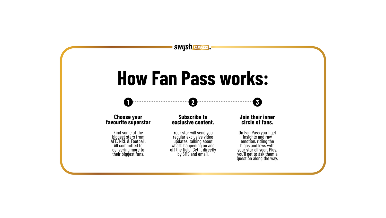 The all new Swysh Fan Pass is a fan’s golden ticket to go behind the scenes with their favourite star all year round. You’ll join your star’s Official Fan Club, receiving exclusive video updates from them talking about their life on and off the field. The perfect gift for any fan.